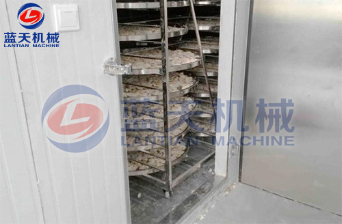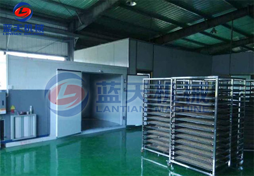 將淮山去皮后切成厚薄均勻,大小一致的淮山片,過水處理,瀝干水分后就鋪放到不銹鋼的物料車架上,注意不要起堆,片與片之間要留有一定的間隙。將車架推進烘干房。烘干設備內置多種干燥工藝模式,利用空氣能原理,在干燥過程中根據物料不同的特性,智能控制溫度、濕度、風量和風速。啟動山藥烘干機,開始向箱內送熱風,慢慢將箱內溫度加熱至50℃,加熱30分鐘至1.5小時,濕度升高,才開始少量除濕。