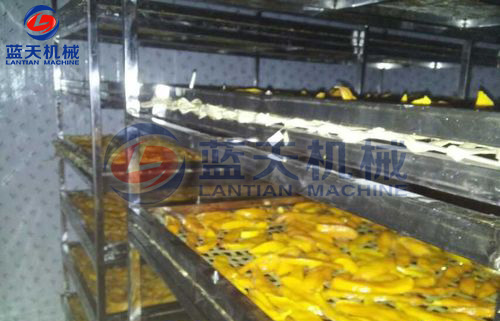 2:芒果烘干前期需要經過清洗,去皮,切片,烘干,抽真空包裝幾個程序,今天我們注意介紹烘干過程的溫濕度控制技巧,芒果片烘干的量一般比較大,兩臺12P主機構成的烘干系統,每批次可以處理2.5噸的新鮮芒果片,耗時30小時完成一批次干燥,系統時間分為5段完成,第一段55度,升溫,3小時,第二段60度,開始排濕,第三段62度,連續排濕,第四段58度,開始降溫排濕,最后一段55度,排濕鞏固。