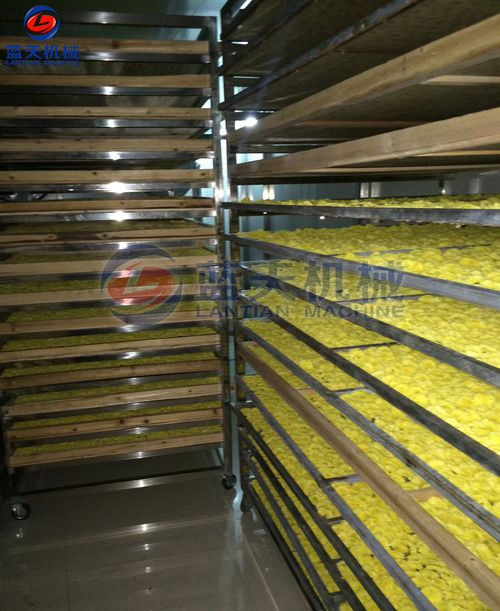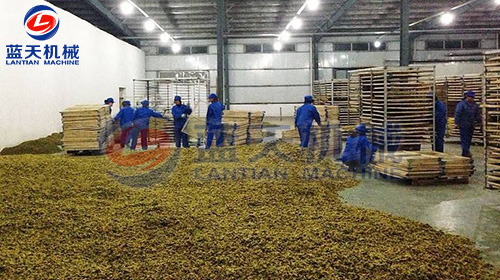 第三步——烘干,將烘車推入烘房,關閉烘房門,打開烘干機電源。這里以藍天機械烘干機為例設置烘干參數,第一段8小時,溫度45℃,第二段8小時,溫度50度,第三段6小時,溫度55度。設置完畢,返回初始界面,點擊開機即可。設備會自動運行,注意每隔8小時要觀察一下金絲皇菊烘干情況。待烘房濕度降至13%左右即可出爐。