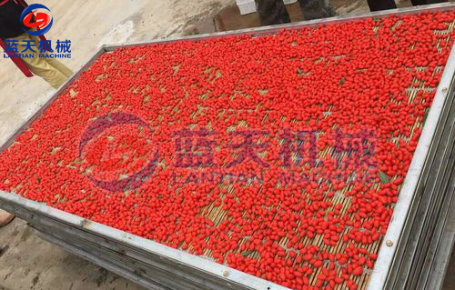 第一階段是升速干燥階段。干燥室內(nèi)溫度上升到35℃-40℃,循環(huán)風(fēng)速2.3米/秒,溫度37℃-45℃。循環(huán)風(fēng)速1.3米/秒時(shí),熱風(fēng)的傳遞和鮮果游離水分的擴(kuò)散蒸發(fā)加快,尤其是果實(shí)皮層失水多達(dá)50%,表皮出現(xiàn)曲皺,果肉內(nèi)含結(jié)構(gòu)水也從皮層氣孔開始慢慢滲出蒸發(fā),次期的升速脫水,果內(nèi)糖分濃度加大,抑制了果內(nèi)活化酶的活性,保護(hù)了多糖、維生素、氨基酸等主要成分不被轉(zhuǎn)化或損失,尤其對紅色素保護(hù)好,干燥的果實(shí)色紅質(zhì)量高。這個(gè)階段歷市時(shí)20個(gè)小時(shí)左右。