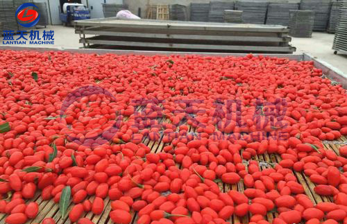 枸杞鮮果干燥的普遍現(xiàn)象是果實(shí)表面水分?jǐn)U散大于內(nèi)部擴(kuò)散速率,果內(nèi)含游離水外滲速率大于結(jié)構(gòu)水外滲速率,這是枸杞鮮果內(nèi)含糖分高導(dǎo)致脫水干燥困難的緣故。如果干燥室內(nèi)溫度過高,鮮果表面水分散失過快,而果內(nèi)水分的外滲又供不上來,則表皮會起泡,阻塞了排水氣孔,反而使果內(nèi)水分排不出來,此時(shí)皮層已脫色、品質(zhì)下降。所,鮮果先進(jìn)行表面油脂冷浸處理,加上適宜的溫度和風(fēng)速,在表皮脫水的同時(shí)通過氣孔透入果內(nèi)的溫度升高,有利于果內(nèi)的水分排出,從而加快了干燥速度,并能保證烘干質(zhì)量。