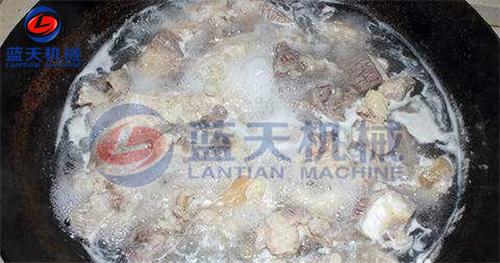 鍋內按每千克豬肉加水1.2千克加入適量的水,加入香袋和硝酸鈉及安息香酸鈉,與肉共煮沸30-40分鐘,待肉塊出完血沫為止。