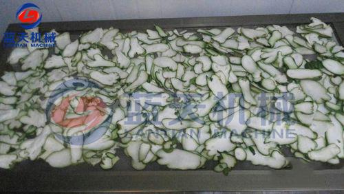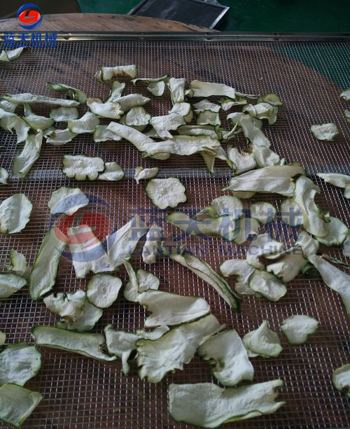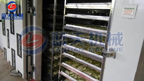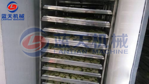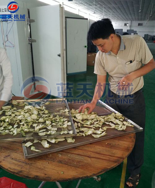 將切片好的佛手片放置于物料車托盤,注意堆放厚度不要超過3CM,這樣有助于烘房內平流風對整個物料的烘干效果保持一致性。