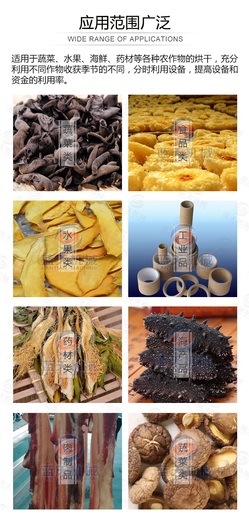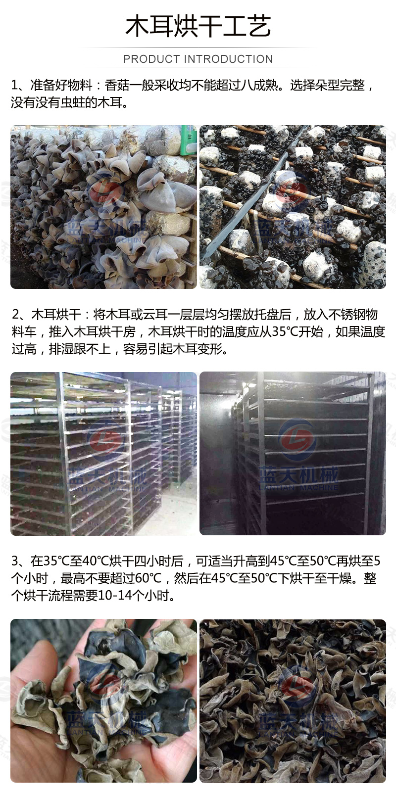 三:設定木耳烘干機的運行參數,要注意在整個木耳烘干過程中前段用35-45度低溫主要進行除去濕度,因為鮮木耳的含水率很大,到中段時可以適當升溫到50度,進行升溫排濕,后一階段觀察木耳含稅率下降情況,可適當升溫到55度,在經過十多個小時的連續烘干除去濕度后,木耳烘干了。