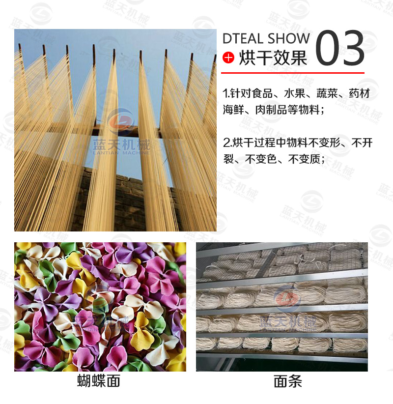 一、自然干燥:就是在風和日暖(氣溫不低于20℃)相對濕度 60%一 80%的地區或季節,將濕面條掛在掛桿上,自然風干。由于烘干時間長,因此產品質量好且不易出現酥面。我國民間多用此法。