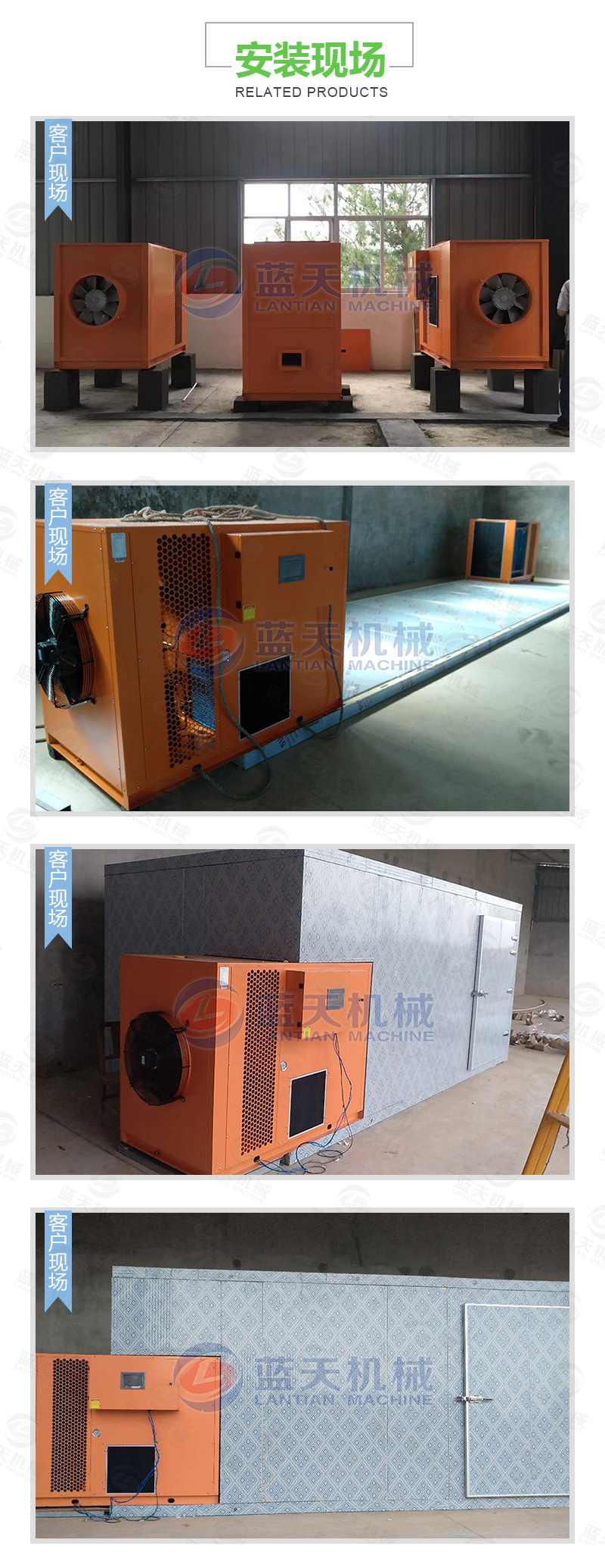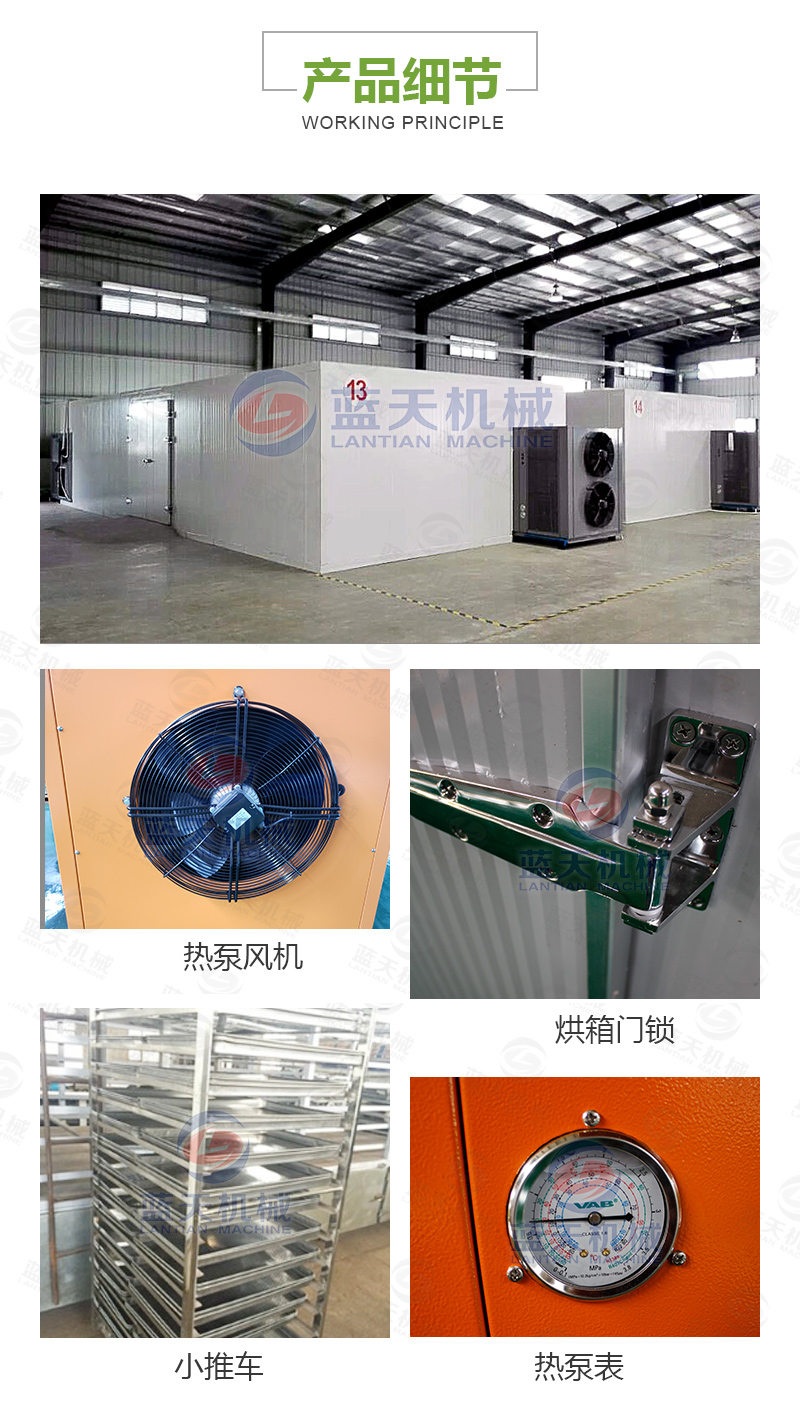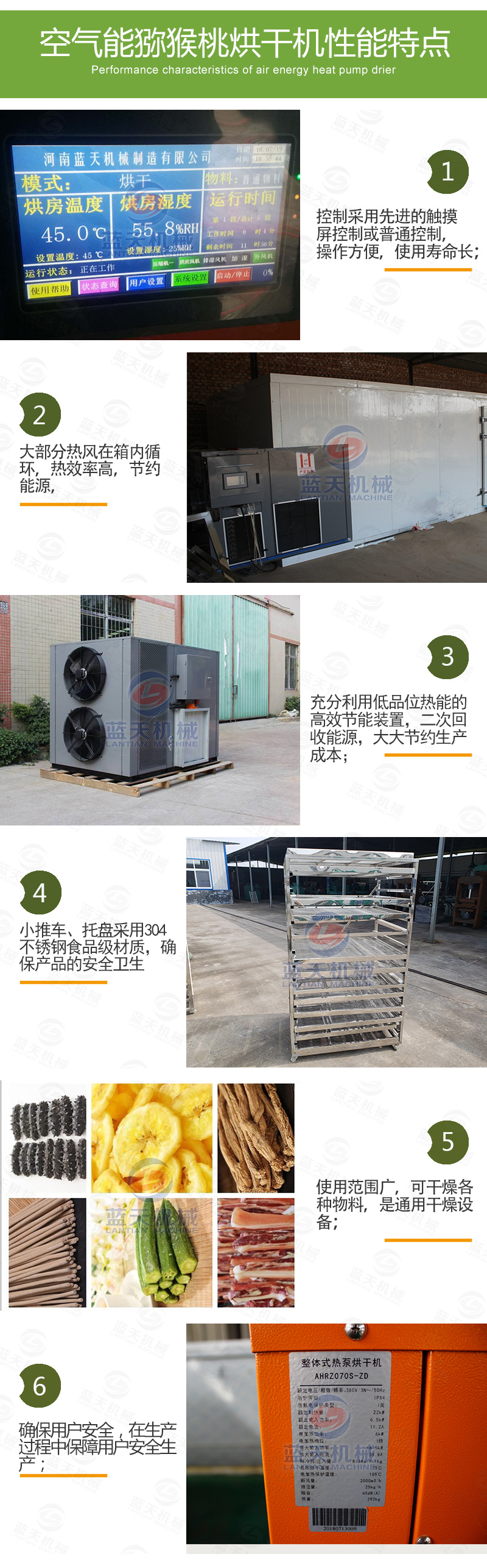 1.熱源空氣能熱泵機組。2.烘干機保溫房體。3.烘干機內部熱風循環裝置。4.自動排濕裝置。5.溫濕度智能控制裝置。6.裝放獼猴桃干的物料小推車和物料托盤。