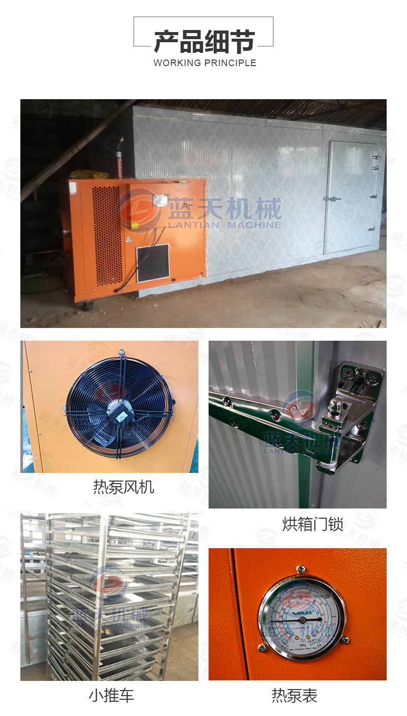 2.葡萄干烘干機熱泵烘干:托盤裝載量14~20kg/m~2,初溫45~50℃,終溫70~75℃;烘干時間42~60h。系統(tǒng)除濕量要大,脫水率已達(dá)70%。葡萄全干后仍保持綠色。烘干干燥適度的葡萄干,肉質(zhì)柔軟,用手緊壓無汁液滲出。含水量為 15%~17%,干燥率為3:1~4:1。