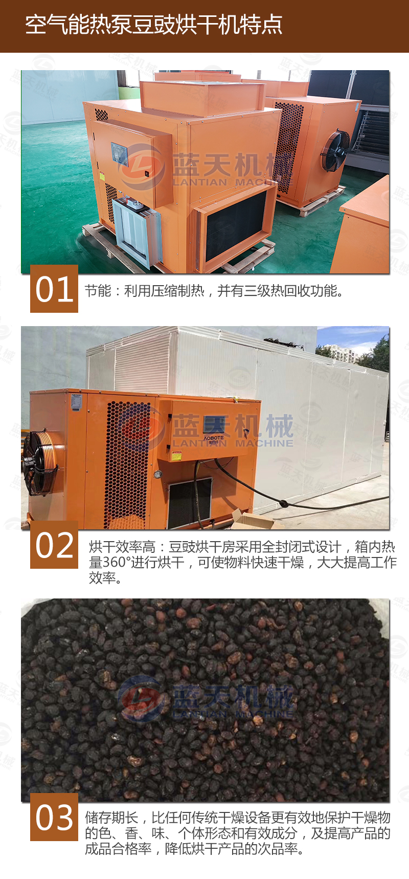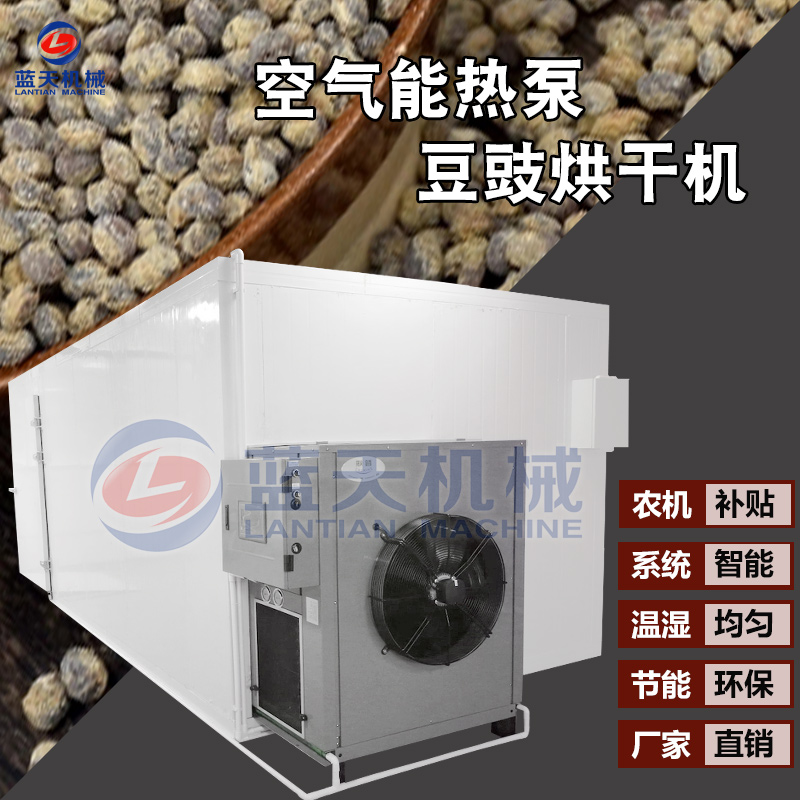 豆豉富含蛋白質、各種氨基酸、乳酸、磷、鎂、鈣及多種維生素,色香味美,我國南北部都有加工食用。但若不注意加工藝,會致使品質下降,甚至霉變,造成經濟損失。傳統上使用太陽光曬制,但是生產效率低下,并且在曬制過程中極容易有污染,本文介紹使用一種基于空氣能熱泵技術的豆豉烘干設備,大大加快了豆豉的生產流程。