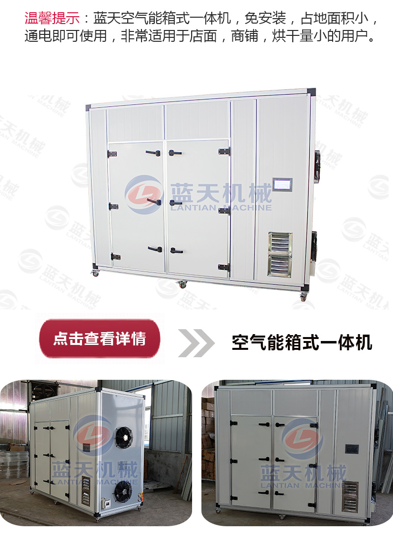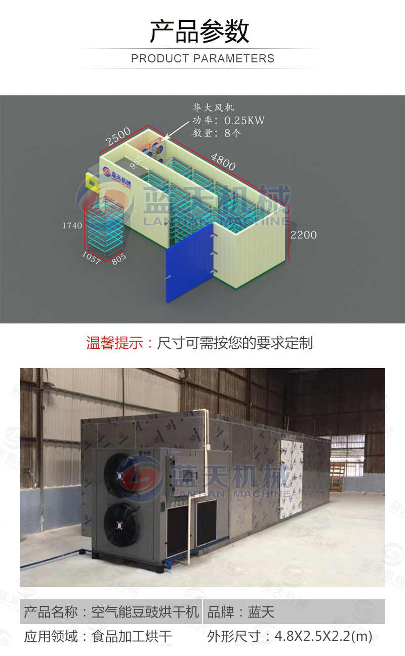 6.1、使用豆豉烘干機進行烘干處理。豆豉晾干發酵完畢,從罐中取出攤在托盤上準備烘干機。豆豉烘干設備使用熱泵為熱源,不需要外接蒸汽,不需要使用基于燃燒的燃煤鍋爐為熱源,環保節能,全程沒有污染,智能控制溫濕參數和烘干時間,直至烘干完成。