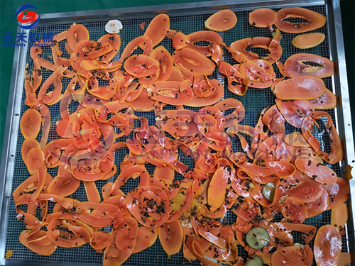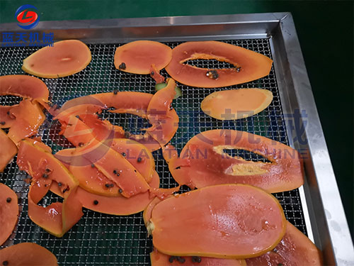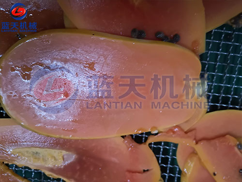 成熟的木瓜切片,厚度均勻的攤到物料盤(pán)上: